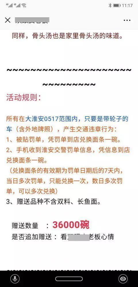 而且还煞有其事地公布了活动规则:只要在淮安境内产生违法交通行为的,凭借罚单或手机收到的罚单信息,均可到他所开的面馆兑换面条一碗。并在其微信朋友圈进行转发。