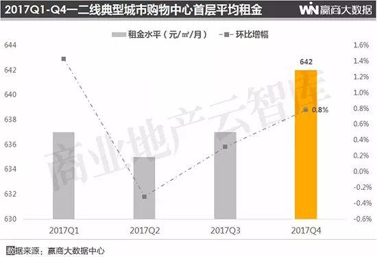 据赢商大数据中心监测,2017年,录得购物中心首层平均租金638元/㎡/月,同比增长1.4%。分季度来看,第4季度新增供应集中入市,加上多个节日的拉动,其录得的租金水平最高,为642元/㎡/月,环比增长0.8%,同比上涨了2.2%。