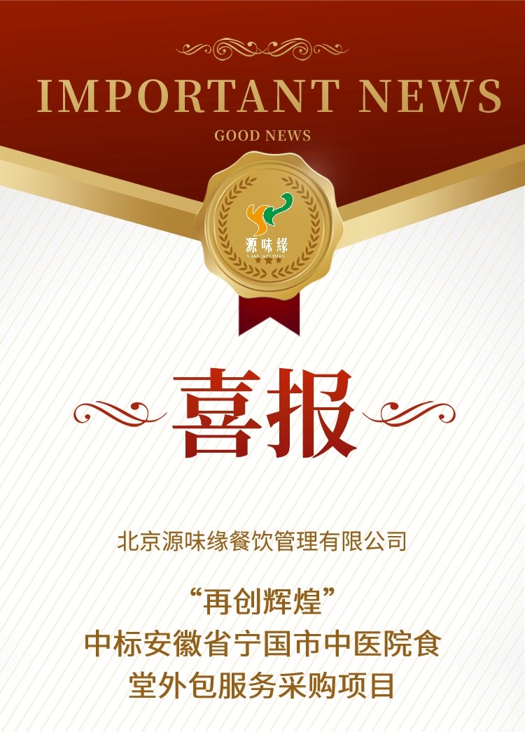 10月18日我公司(华亿线上平台(集团)官方网站)在安徽省宁国市中医院食堂外包服务采购项目二次招标项目的竞标中,凭借过硬的产品质量,扎实高效的工作作风,卓越的运作团队和良好的企业信誉,以绝对优势顺利中标。在此特向全国朋友们通报喜讯。