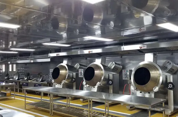 为便于排油烟、美化车间立面,中央厨房设计时应提前规划烟道路径。为满足防锈需要,烟道宜采用不锈钢材质。
