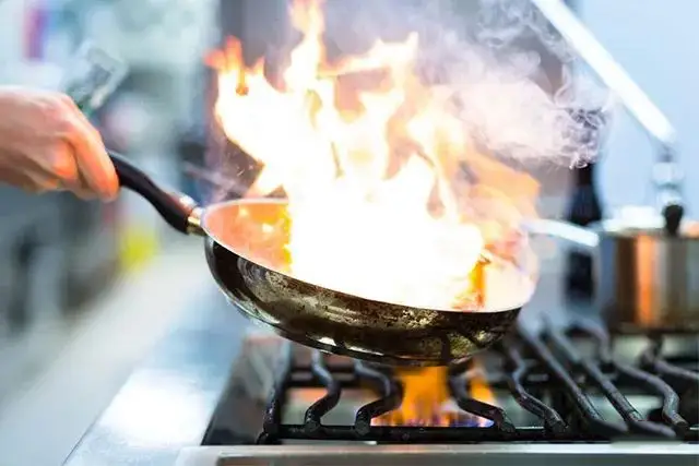 在厨房操作台附近配备灭火毯、灭火器等灭火器材,并要求员工熟悉使用方法。灶台动火不能离人,必须做到营业结束后火熄、电断、气关。